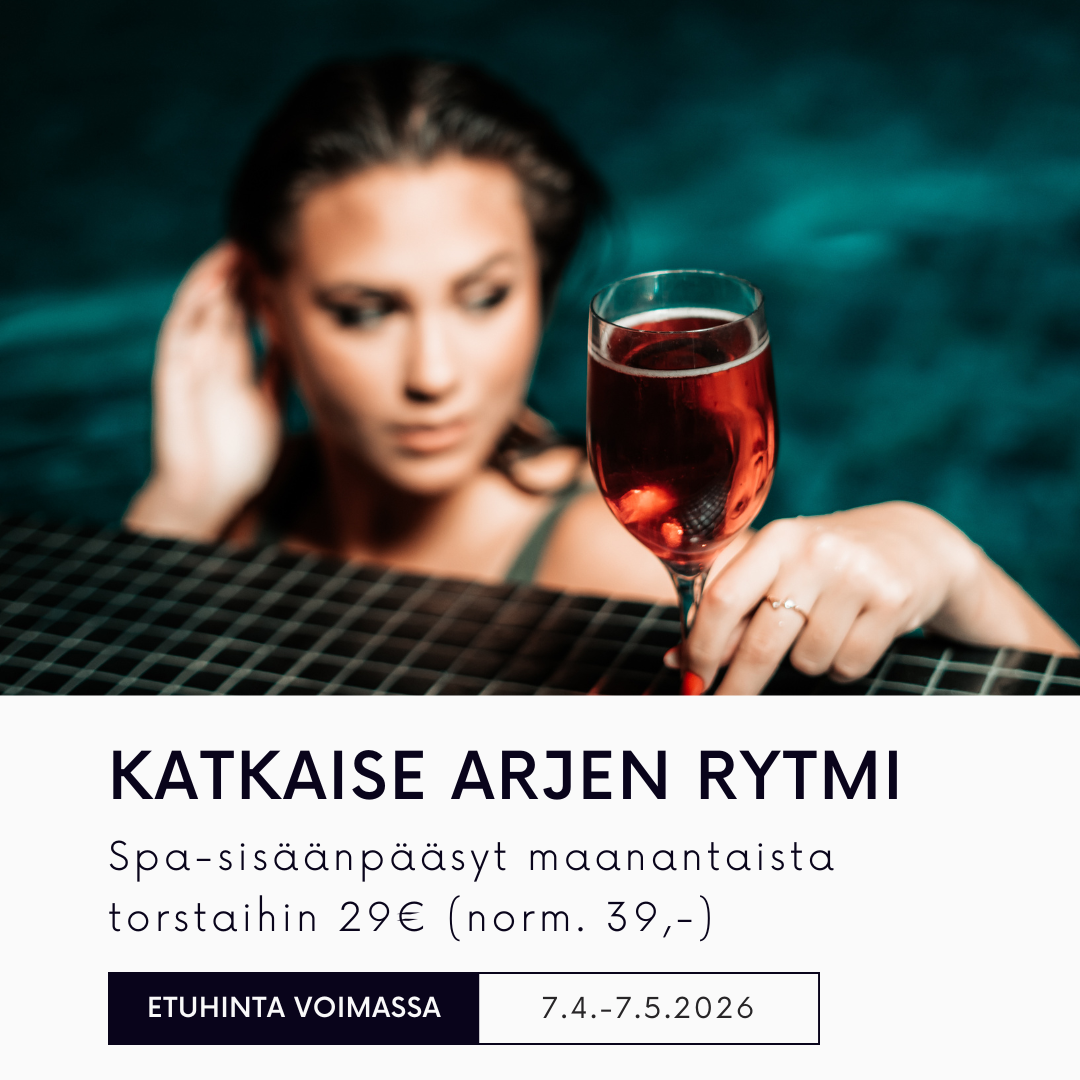 7.4.-7.5.2026 saat spa-sisäänpääsysi etuhintaan 29 € (norm. 39,-) maanantaista torstaihin.